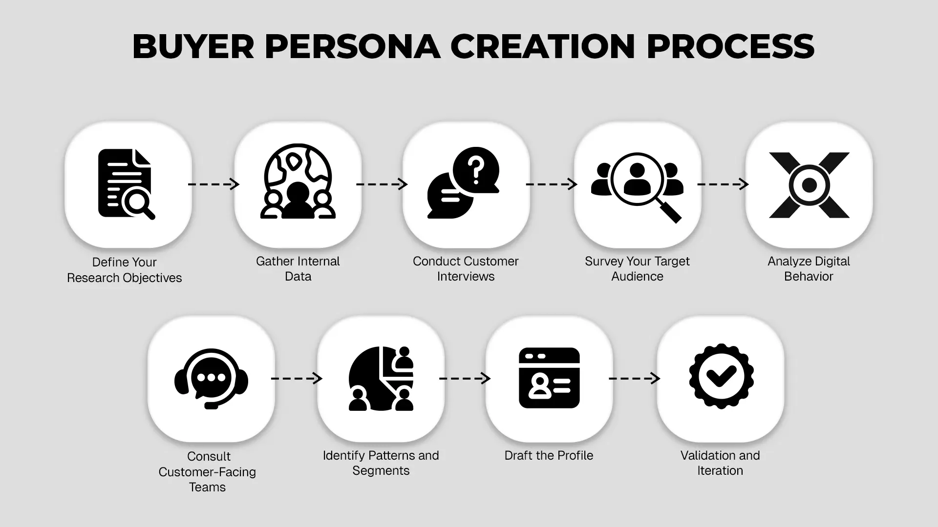 Creating effective buyer personas requires a systematic approach that combines data collection with strategic analysis. Follow this nine-step process to develop buyer personas that actually drive results.