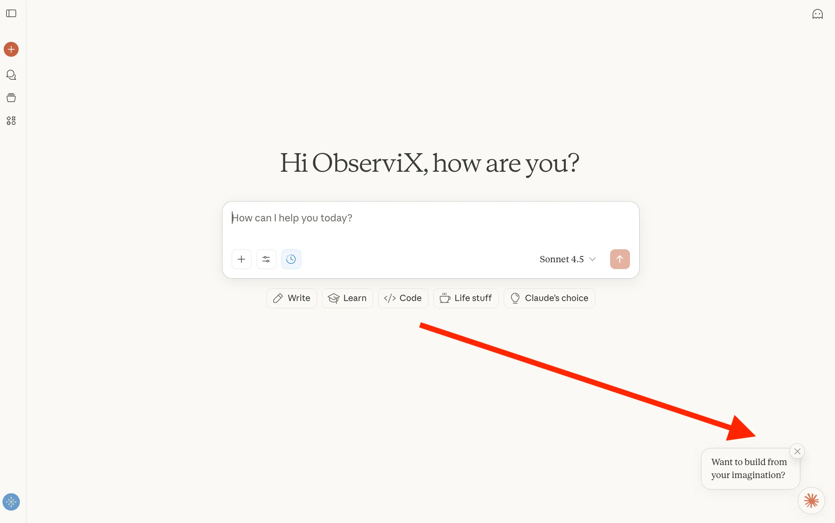 You can access Imagine in two ways: navigate directly to claude.ai/imagine, or if you're already in the Claude chat interface, click the "Want to build from your imagination?" button at the bottom-right corner.