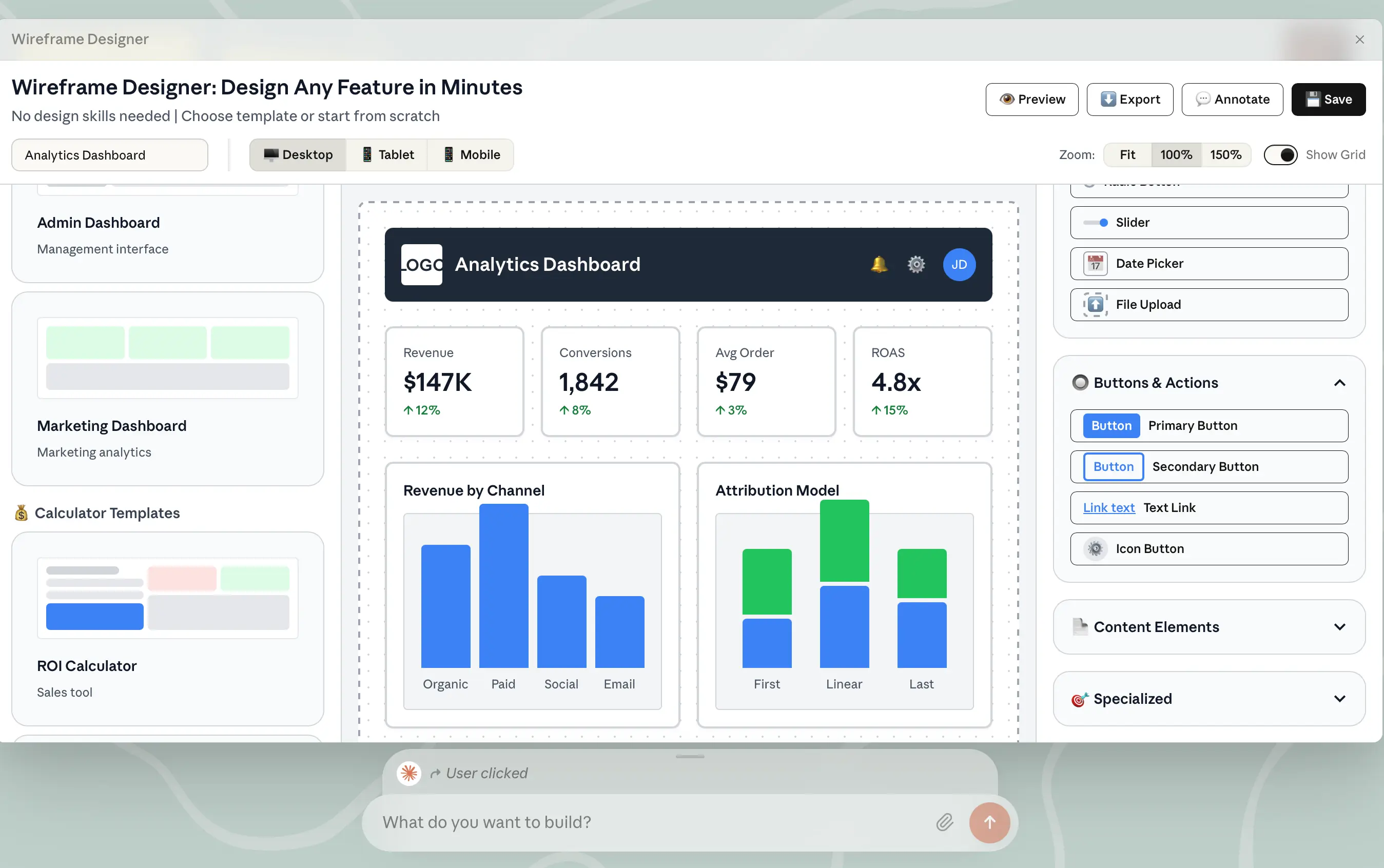 Center canvas: Your working area where the wireframe comes to life. The example shows a complete analytics dashboard with revenue metrics, conversion stats, channel performance charts, and attribution model comparisons. Toggle between desktop, tablet, and mobile views to see how your design adapts.