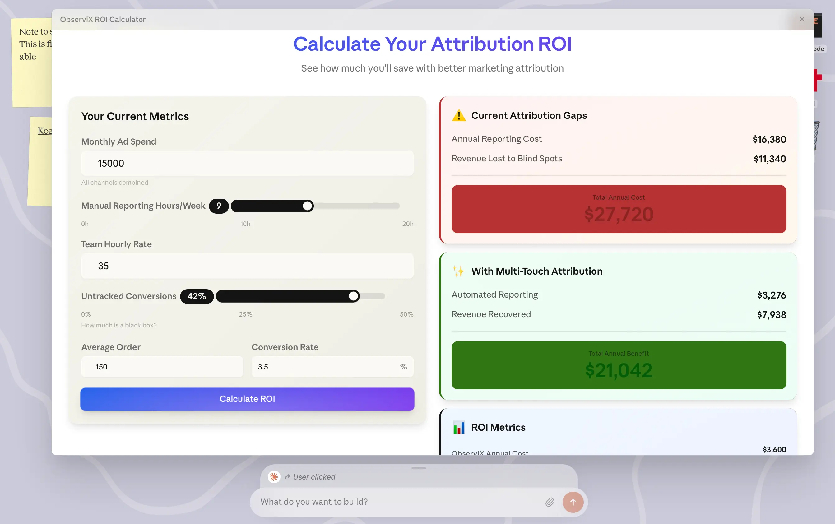 I created this attribution ROI calculator in 15 minutes. The result is a fully functional sales tool that performs real calculations in real-time.